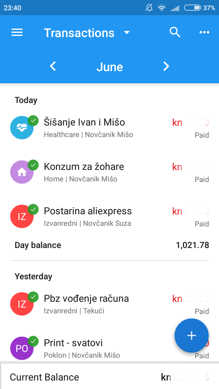 Dalje što trebate je samo unositi svaku transakciju i nemojte biti lijeni. Unosite svaki trošak, svaki prihod, svaki transfer (s tekućeg u novčanik, iz suprugovog novčanika u suprugin novčanik i sl., shvaćate već princip) odmah kad se dogodi. Zato aplikacija i je mobilna da bude u svakom trenutku dostupna, naravno, ako je mobitel uz vas.